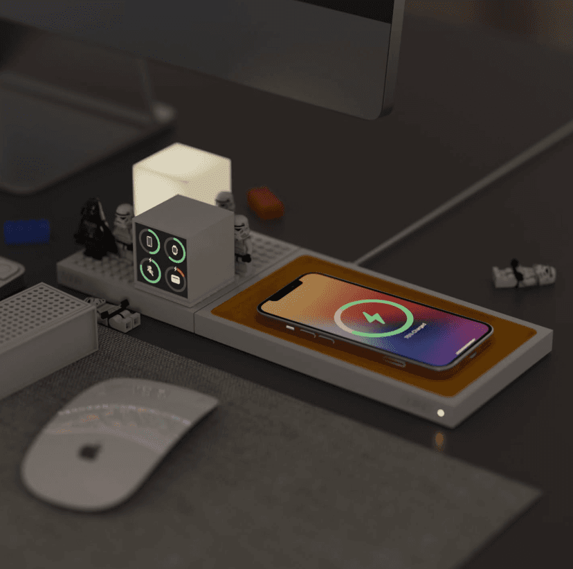 Geniotek designed a fully customizable LEGO-inspired wireless charging platform that allows users to snap different functional modules onto a magnetic power grid base. Components such as clocks, speakers, ambient lights, and phone chargers can be rearranged freely to suit individual workflows and personal style.